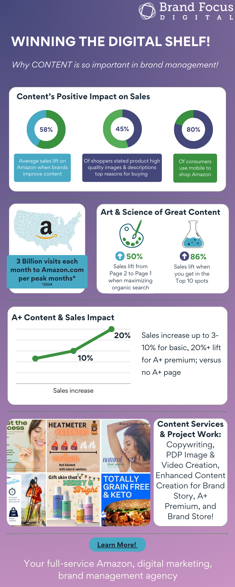 Amazon Pay-per-Click (PPC) advertising is a powerful tool that merchants should utilize for more profitable online sales. With PPC advertising capabilities for a multitude of platforms, Brand Focus Digital is here to help! We’re a full-service eCommerce agency with proven success of triple-digit sales & ROI increases on Amazon, Walmart, Instacart and more!